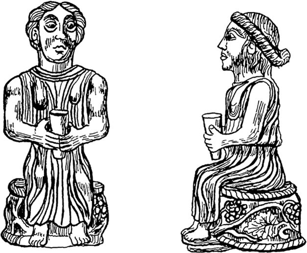 На этом кратере (рис. 140) изображены Дионис и его мать Семела. Они здесь ровесники, в своем вечном воплощении, просто мужчина и женщина, мать и ее дитя, но одновременно и спутник, духовный супруг женщины. Между ними изображен фиал с вином – позднее в нем будет Кровь Господня во время христианской мессы. Очень интересны жесты изображенных: это мудра, символический жест, который используется в индуистской медитации и обозначает силу и жизненную энергию сознания в этом мире. То же самое изображено на сценах коронации Святой Девы Христом в раю, это – вневременное пространство отношения матери к тому, кто пришел в этот мир как ее дитя.