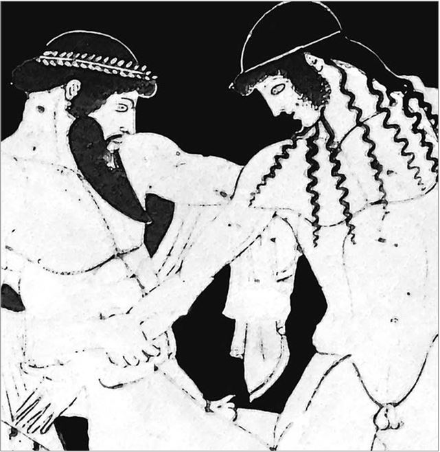 Изображение на килике (рис. 82) рассказывает о похищении Зевсом Ганимеда, чтобы тот служил виночерпием на пирах на Олимпе. Об этой роли во время совершения мужских ритуалов я уже упоминал: отделить красивого мальчика от внешнего мира. Но Зевс сумел связать себя с более древними мифологиями.