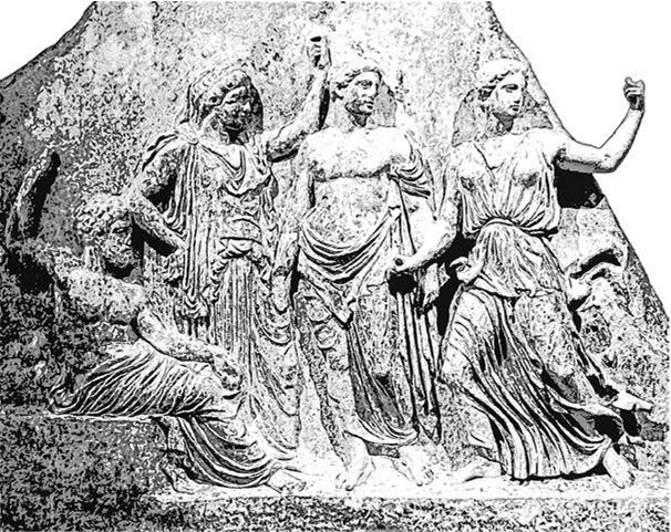 Рис. 83. Зевс, Лето, Аполлон и Артемида (мраморный барельеф, античная Греция, IV в. до н. э.)