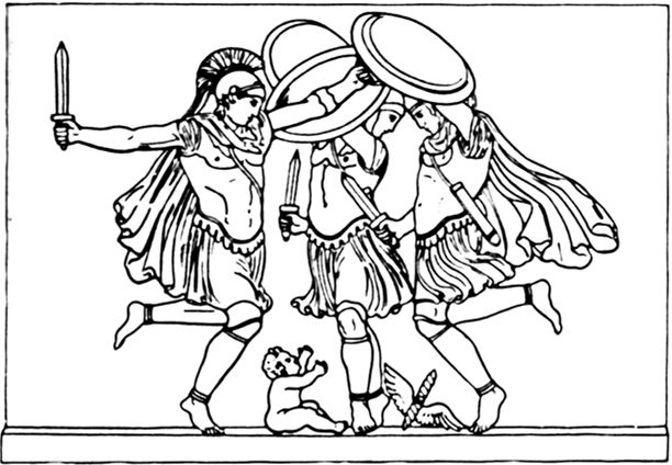 Рис. 84. Куреты танцуют вокруг новорожденного Зевса (терракотовый барельеф, местонахождение неизвестно, дата не установлена)