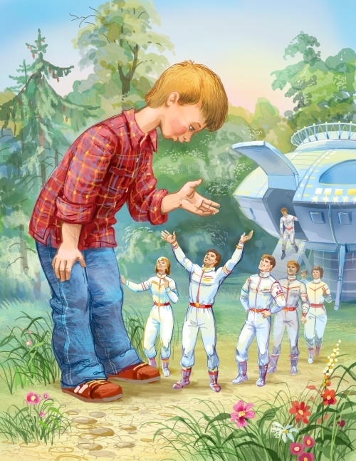 – Корабль у нас научно-исследовательский, – говорит капитан. – Экспериментальная модель, единственная в своём роде. Мы все добровольно вызвались в экспедицию и не знаем, вернёмся ли когда-нибудь в своё родное будущее время. Ведь коридоры времени открываются и закрываются в произвольном порядке, и управлять ими мы не умеем. Можем только перемещаться по тем коридорам, которые в данное время открыты… Теперь о тебе. Родился ты у Владимира и Светланы в одна тысяча пятьсот шестьдесят шестом году, когда Русью правил грозный царь Иван Четвёртый. Наши комбинезоны умеют принимать вид одежды того времени, в котором мы сейчас находимся. Вот твои родители «переоделись», пошли в храм Божий и окрестили тебя Владиславом. Собрав все необходимые исторические сведения, мы покинули то время и скакнули в начало двадцать первого века. Тут у нас поломался бортовой компьютер, и штурман сказал, что при следующем временно?м скачке мы можем не выйти из коридора и застрять в межвременье. Нас бы всех ожидала страшная смерть! Родители испугались за тебя и решили оставить в этой эпохе. Но самим им долг не велел покидать экспедицию, поэтому они не могли остаться вместе с тобой. Они пошли на ближайший хутор и подкинули тебя зажиточному фермеру. Наш штурман оказался прав – мы не смогли выйти из коридора времени. Тогда мы всем экипажем встали на колени перед иконой Спасителя и стали молить Его, чтобы Он избавил нас от лютой смерти. И произошло чудо: компьютер вдруг починился и вывел наш корабль из коридора. Мы оказались в девятьсот восемьдесят восьмом году и наблюдали Крещение Руси. Конечно же, родители очень скучали по тебе, но мы вынуждены были продолжать экспедицию в надежде, что когда-нибудь опять попадём в начало двадцать первого века и сможем забрать тебя. И вот так оно и случилось – мы здесь! Выйдя из коридора времени, мы определили твоё местоположение по вживлённому под кожу датчику и прилетели за тобой!