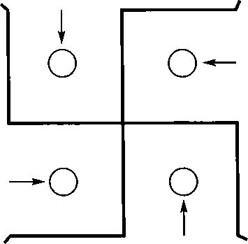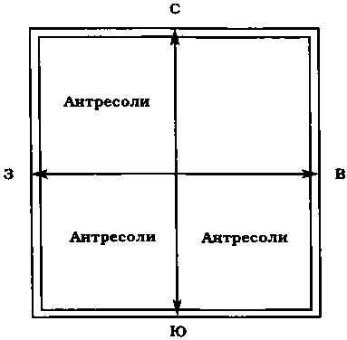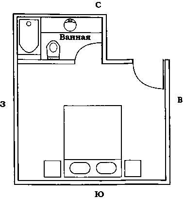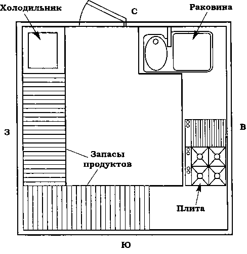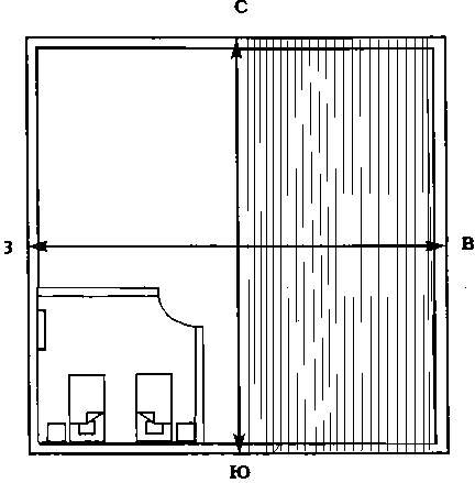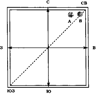 Хорошо, если подземный резервуар для воды находится в северо-восточном секторе (как в Л), но избегайте диагонали между северо-востоком и юго-западом (как в В). Проектируя здание важно помнить, что канализационные трубы должны быть максимально удалены от источника воды и могут проходить по любой стороне.