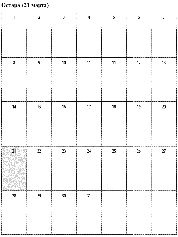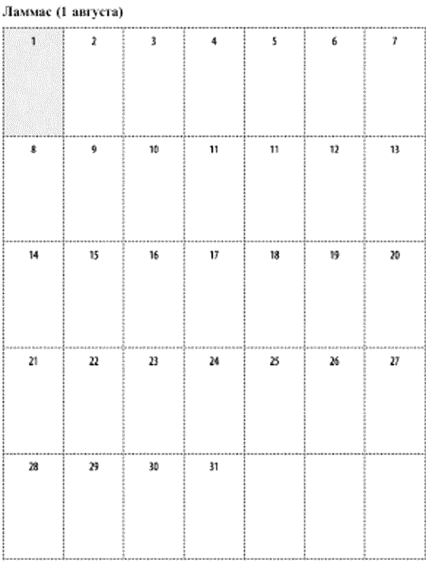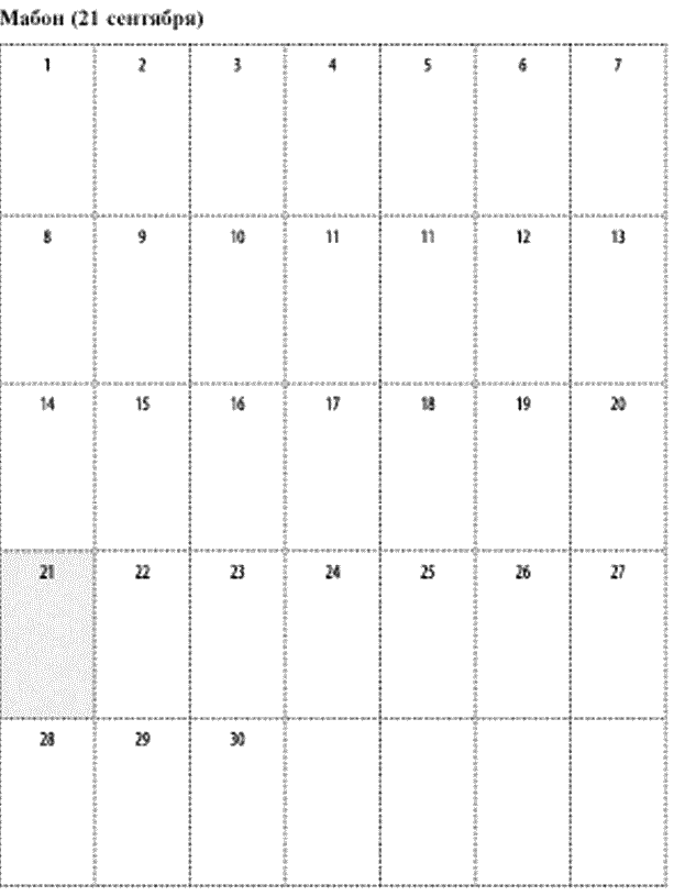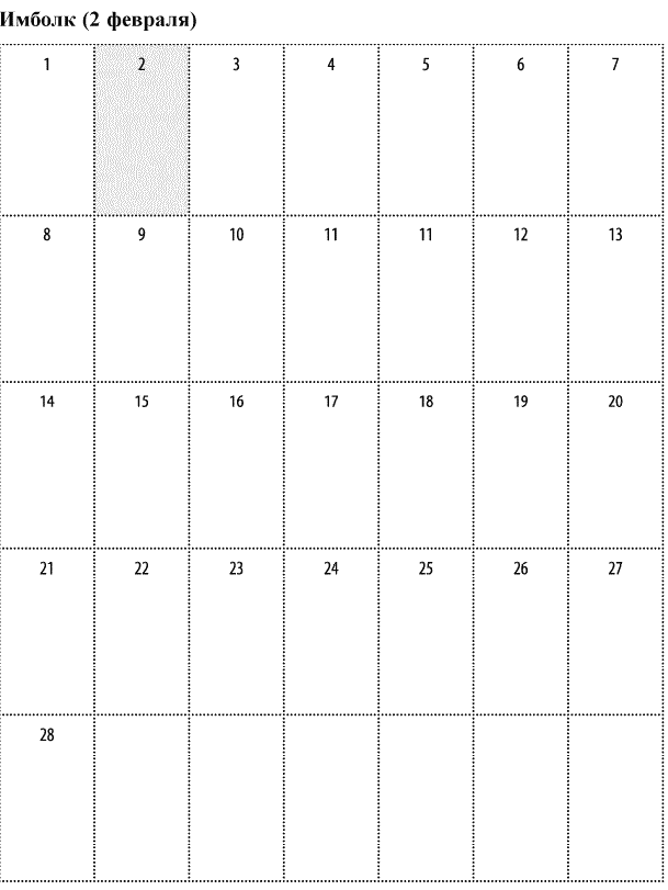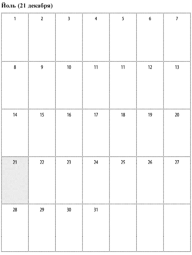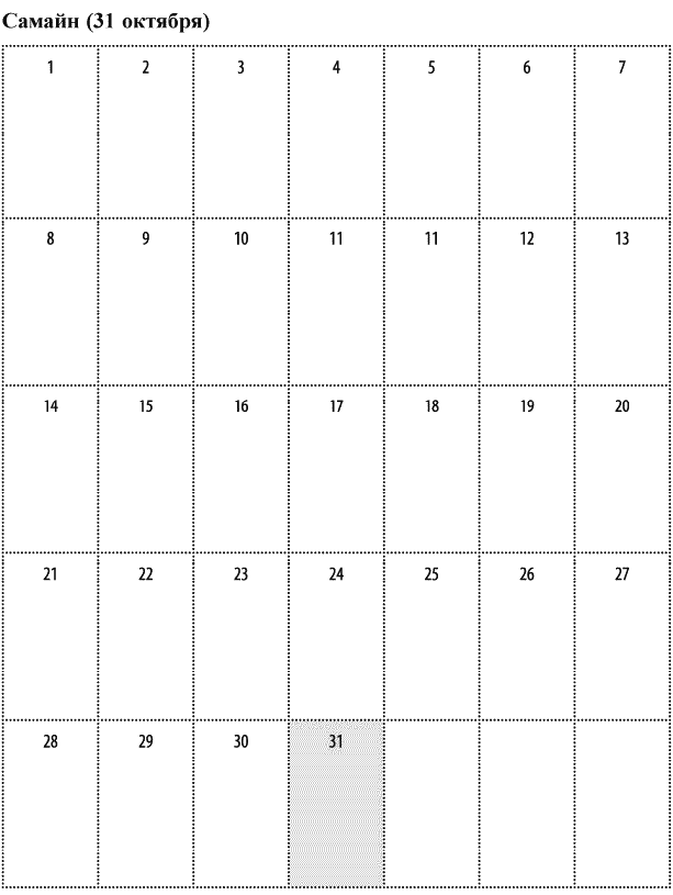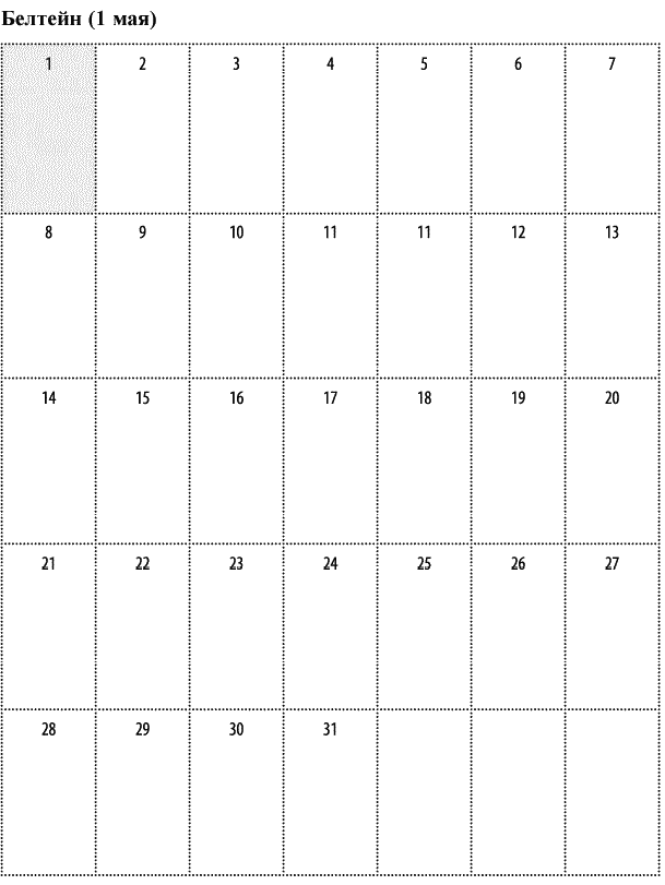 Дорогие ведьмы, напоследок – еще одна таблица-календарь, чтобы вы успели вовремя со всеми вашими приготовлениями. Обычно у меня на каждый праздник уходит месяц подготовки: я составляю список всего, что нужно купить, собрать, напечатать, сделать, прочесть, посмотреть, послушать и все остальное. Так вот, эти пустые окошки в календаре – специально для ваших заметок. Составляйте свое викканское расписание, чтобы ко всему быть готовыми заранее. Будьте благословенны, и да пребудут с вами Богиня и Бог во всех начинаниях.