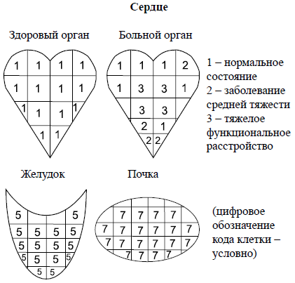 – Нет. Любое заболевание контролируется и протекание его до мельчайших подробностей видно на экране компьютера. Каждый орган имеет цифровую раскладку (см. рис. 1). Одинаковые цифры соответствуют здоровому состоянию. Появление других цифровых значений будут выражать отклонения от нормы и тяжесть заболеваний. Конкретная цифровая зависимость говорит о степени нарушений в той или иной части.