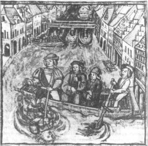 Испытание водой с лодки. Миниатюра из Люцернской хроники. 1513 г.