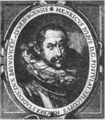 Герцог Генрих Юлиус. Гравюра. Правил с 1589 по 1613 г. При нем столбы для сожжения вкапывали на площади десятками во много рядов.