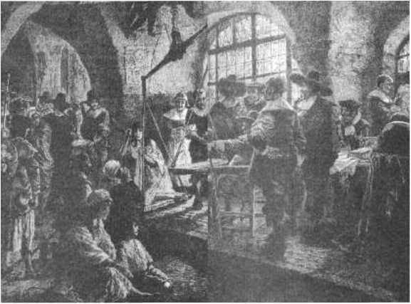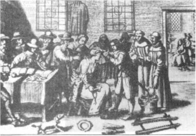 Поиск «чертова клейма» у Кристины Беффген в 1631 г. Иллюстрация к воспоминаниям Германа Лоэра, изданным в 1676 г. Тело подследственной утыкано шильцами. На полу дожидаются своей очереди тиски для ног, розги и ошейник с гвоздями. Кристина умрет на четвертый день пыток, не оговорив никого. Лоэр был непосредственным свидетелем этой сцены.