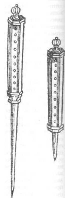 Шила для поиска стигматов дьявола. Иллюстрация к книге Реджинальда Скотта «Розыски колдовства», изданной в 1584 г. У правого шила острие убирается внутрь.