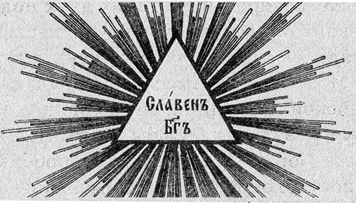 3) В виде равностороннего треугольника вершиною вверх со вписанным в нем славянскими буквами под титлом «Славен Бог».
