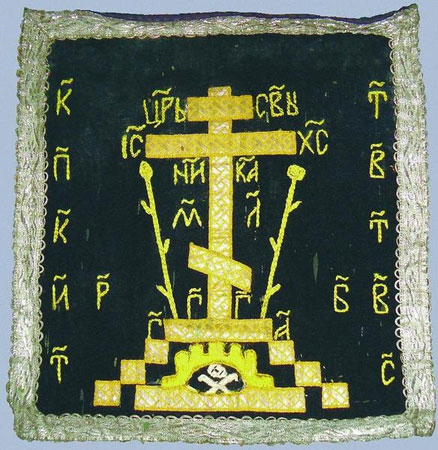 Пелена под икону. Ранее использовалась в старообрядческой часовне. Шёлк, бархат, галун, шитьё цветными нитями. Из ризницы Воскресенского храма пос. Верх-Нейвинского