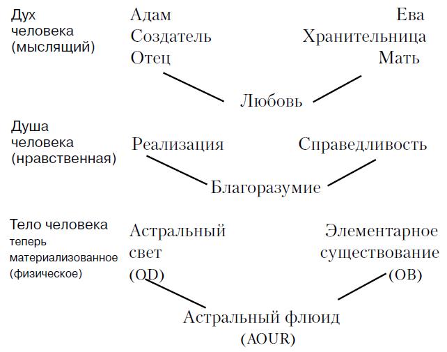 Из единственного, но непостижимого центра происходит, во-первых, триада Абсолютных принципов, которые служат моделью для всех последующих эманаций самого принципа Бытия. Каждый элемент этой триады проявляется в двух великих началах, которым он является источником: из первого начала, Отца, происходят последовательно Адам и Природа, создающая naturans, согласно Спинозе; из второго начала, Сына, происходят Ева и Природа naturata или получатель; наконец, третье начало, Святой Дух, служит моделью для подобного же образования Адама-Евы или Человечества и Мира.