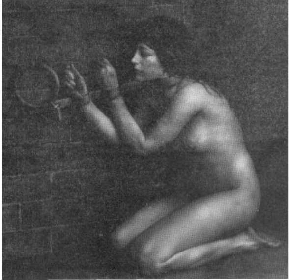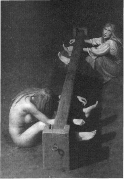 Такова была темница для ведьм, если судить по словам современника. В этом описании нет ни слова лжи. Существуют безмолвные, но красноречивые свидетели. Можно ли сомневаться в реальности колодок, если они сотни раз зарисованы старинными художниками, да ещё вдобавок уцелели сами по себе. Когда я писал картину «Темница», я взял за образец колодки из собрания Нюрнбергского музея — и мне было из чего выбирать, поскольку в моем архиве не меньше десятка фотографий, переснятых с музейных фотоальбомов. Не пришлось долго искать оковы и для других картин. Даже беглого знакомства с книгами в московских библиотеках оказалось достаточно, чтобы найти необходимый материал.