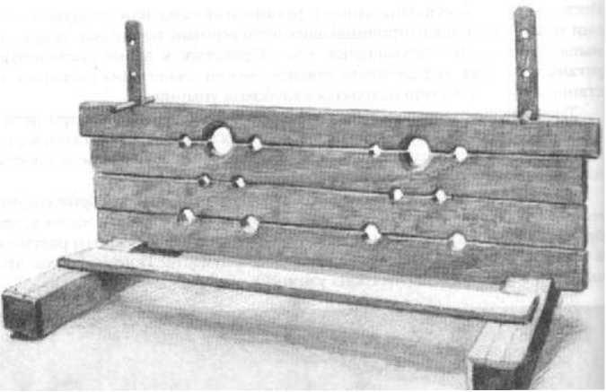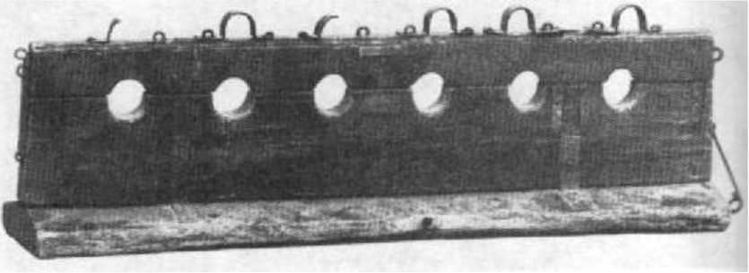 «Тюрьму обычно устраивают в крепких толстостенных башнях, подвалах, погребах или же в тёмных ямах. Есть там большие толстые брёвна, которые расположены по два-три одно на другом. Их можно двигать вверх и вниз, ибо они нанизаны на штыри или вставлены в пазы врытых в землю свай. На стыках этих толстых досок прорублены дыры для рук и ног. Когда узницу вводят в подвал, колодки раздвигают, и лодыжки велят вложить в нижние отверстия, а запястья в верхние, после чего деревянные брусья вновь тесно смыкаются. Их завинчивают или крепко-накрепко запирают. Беспомощная узница сидит на комьях, голом камне или земле, не в состоянии двинуть руками и ногами, почти не шевелясь.