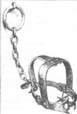 «Ведьмину сбрую» (а именно так называли тяжёлый убор) надевали на женщин надолго. Железные полосы охватывали голову со всех сторон. Сзади запирали висячий замок. Напротив рта был выкован железный кляп, состоящий из нескольких стержней. Два упирались изнутри в щёки, остальные были направлены к нёбу и языку. Есть, пить или разговаривать с такой затычкой нельзя, но тюремщики и не ждали от ведьм скорой откровенности. В задней части сбруи находилось кольцо, за которое узницу приковывали к стене камеры. Полураздетую женщину вразумляли наставлениями и оставляли под присмотром стражи. Теперь можно было и подождать. Дни и ночи тянулись медленно. Спать узнице не давали. Стоило ей сомкнуть глаза, как бдительный надзиратель пихал её или наотмашь хлестал по лицу плетью, возвращая к суровой реальности. Шло время, стража сменялась. Заключённая вынужденно бодрствовала. Неделя бессонницы обычно давала ожидаемый результат. Когда «ведьмину сбрую», наконец, снимали, судья, как правило, выслушивал то, что желал услышать. Но были и упрямицы. Для одной колдуньи потребовалось девять суток, для другой — трудно поверить — двадцать. Последнюю звали Маргарет Томсон. Целых двадцать дней и двадцать ночей ей не давали спать. Во время дознания Маргарет оставалась почти голой, на ней не было ничего, кроме дерюги. Её держали в колодках в полной изоляции, а главными истязателями были местный учитель и приходской священник (Black, 1938 стр. 129).