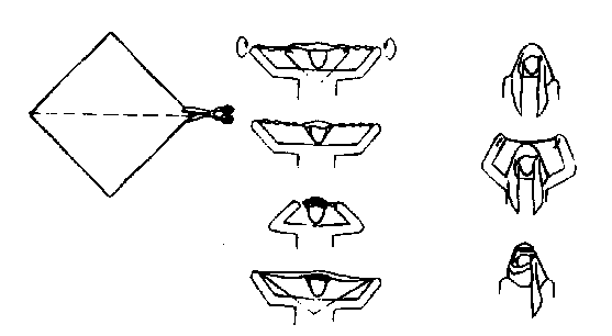 Профилактика перегревания. Одежду для пустынных походов надо шить из легкой белой хлопчатобумажной ткани. В аварийной ситуации из кусков ткани можно изготовить халаты или плащи-накидки. Одним из лучших средств для защиты от жары и профилактики тепловых ударов является головной убор арабских кочевников – куфия (рис. 20). Делают его из куска белого материала с размерами сторон 1,2 на 1,2 м или чуть меньше. Квадрат материала разрезают по диагонали на два треугольника.