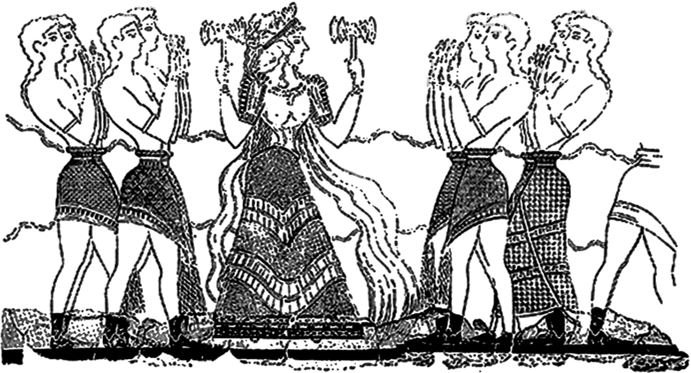 Группа танцующих женских фигурок с головами грифона ассоциируется с Богиней, которая отделяет мир смерти от мира бессмертия и выносит решение об этом. В культе, где преобладают изображения женщин, подчеркивается важность чувственного опыта и происходит своего рода разрыв в религиозных верованиях, который естественным образом перетекает в ритмическое движение и танец. Именно танец, а не догма, потому что теоретический аспект религии формируется в мужских мифологиях. Женщины стремятся к опыту, и они призывают его через танец, как в культах Бахуса и Диониса, в танцах, которые исполняют спустя многие годы воздержания.