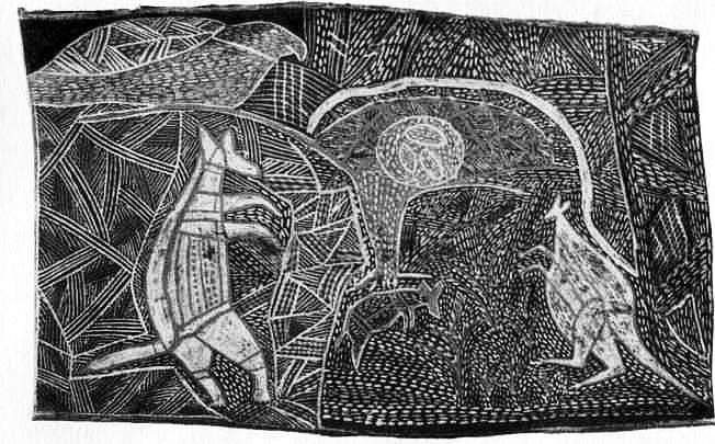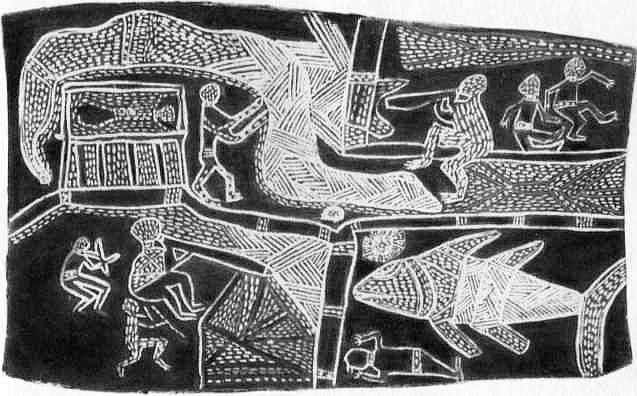 Австралийский рисунок на коре, изображающий битву животных-тотемов.
