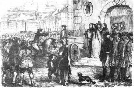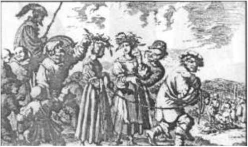 Ян Люйкен. Дорога на костер в Бамберге в 1520 г. Гравюра. Конец XVII в. Фрагмент. Венками из соломы девушек «украшали» в знак издевательства.