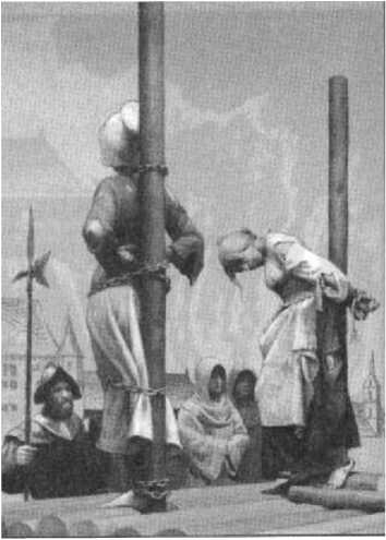 Как видно, своей сговорчивой покорностью колдуньи заслужили снисхождение. Их не рвали по дороге клещами, не осыпали бранью. Устроители казни предпочли жестокости чинное зрелище. Такое бывало и в других странах. Во Франции, например, образ кающейся грешницы закладывался уже в формулировку приговора. Скажем, приговор Жанны Алюмбер, 34-летней дочери батрака, звучал так: «Вышеозначенная обвиняемая будет передана в руки палача и будет приведена в рубахе, босая, к главному порталу приходской церкви Нантюа. Там, держа в руке горящий факел, она принесёт публичное покаяние, говоря и объявляя, как в мерзком неверии она забыла Бога, отречётся от прельщений и обманов дьявола, которому служила и поклонялась, будет каяться и просить прощения у Бога, Короля и Правосудия».