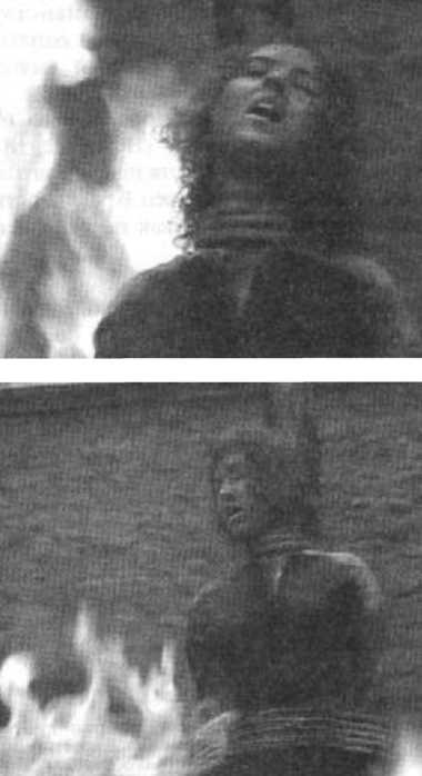 Кадры из французского фильма «Страсти по Беатрис». Реж. Б. Тавернье. 1987 г. Сожжение на медленном огне показано в кинокартине во всей его страшной обыденности. На деревенской площади собралась небольшая толпа. Моросит осенний дождь, не дающий костру разгораться слишком быстро. Женские вопли не прекращаются ни на минуту, но казнь длится слишком долго — зрители устали, их восприятие потупилось. Даже детям, обычно столь любопытным до зрелищ, надоело ждать, когда же наконец эта шумная тетя умрет. Они копошатся на раскисшей земле, затеяв какую-то игру. Смертница, молитвенно сложившая руки, мотает головой от боли; перед ее помутненным взором то возникает, то исчезает звонница деревенской церкви. Храм с крестом — зримый символ той силы, которая несет историческую ответственность за гибель этой крестьянки и сотен тысяч ее подруг по несчастью.