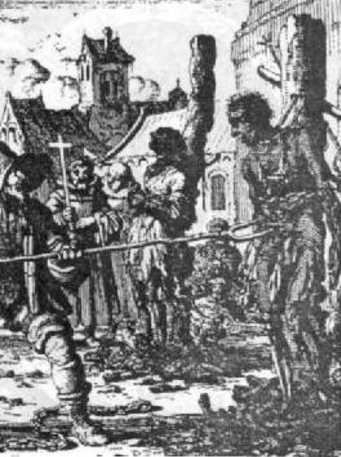 Ян Люйкен. После казни. Гравюры. Конец XVII в. Если власти экономили на дровах, тела могли едва обуглиться.