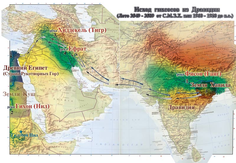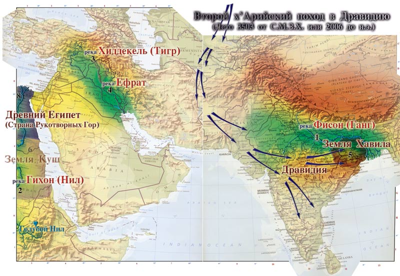 В результате чего, Древняя Эфиопия подчиняет себе Египет, а Ассирия практически контролирует всё Междуречье, в течение восьми столетий непрерывно ведя войны со своими соседями. И везде под разными именами насаждается культ ЧЁРНОЙ МАТЕРИ, но об этом позже. А пока вернёмся к судьбе побеждённых сторонников КАЛИ-МА в Дравидии. Победители — арийские племена, воевавшие на стороне Светлых Сил, ссылают побеждённых в страну Гор Рукотворных. Напомним, что поход состоялся в Лето 3503 от С. М.З. Х. или 2006 г. до н. э. (см. Рис. 5).