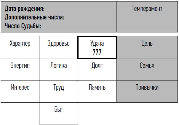 «Удача» 7/77/777 + «Энергия» 22/222/222 + «Интерес» 33/333 + «Быт» 3/4/5 – «код успешности», большое количество возможностей и потенциал для их использования.
