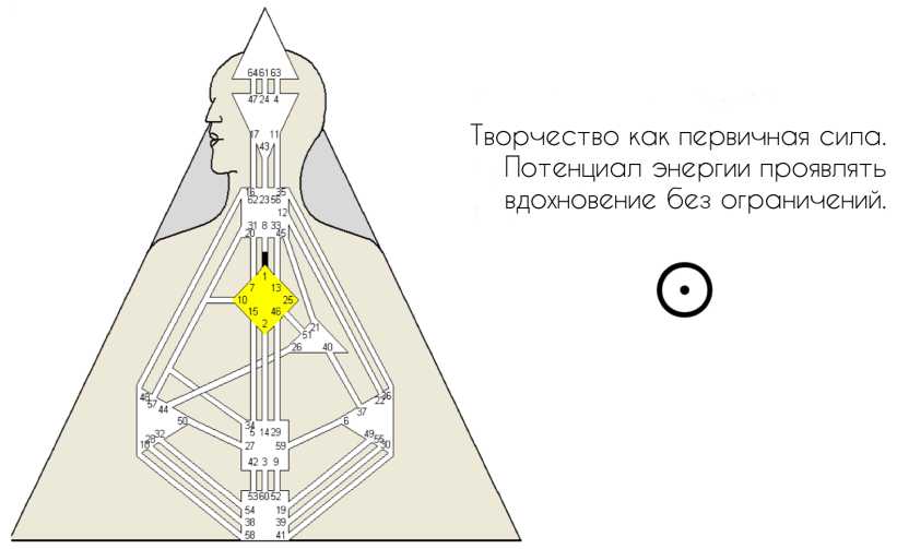 Я начну с Солнца как основного источника нашего программирования. Где бы ни находились позиции сознательного и подсознательного солнца в бодиграфе, эти позиции соответствуют 1-м воротам G-центра. Солнце через свои ворота и их линию определяет весомую часть нашего характера, поскольку это 70% всего потока нейтрино, проходящего через нас, и это всегда чистый Ян. То есть это самый мощный источник программирования нашего характера, и это то, что нам предназначено проявить в мир — это наш внутренний свет. Древние китайцы называли эту гексаграмму энергией, а в Дизайне 1-я гексаграмма называется творческий.