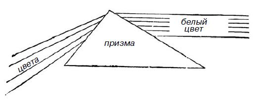 Помещаем призму, обозначенную треугольником, в центре; белый свет, представленный параллельными линиями, проникает на нее с одной стороны: с другой – исходят цвета. Они представлены преломленными и более или менее косыми линиями.