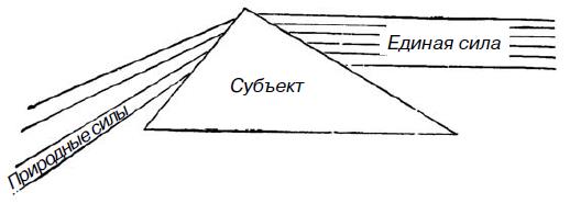Здесь разные количества энергии представлены разной толщиной призмы, единая сила, соответствующая белому свету, – параллельными линиями, различные физические силы, соответствующие разным цветам – преломленными линиями.