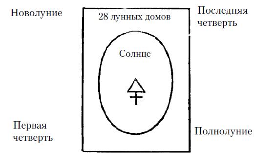 Здесь показано движение Солнца, как оно образует год. Если мы хотим узнать то же о Луне, как она образует месяц, то четыре времени года стали бы четырьмя фазами Луны, а зодиак – двадцатью восемью домами луны, центр – Солнцем, которое одушевляет Луну; т. е.: