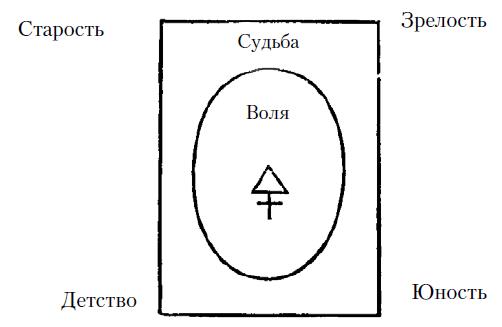 Глубинный символ показывает, что человеческая воля творит судьбу, по которой человек следует, под влиянием предопределенного цикла четырех возрастов человеческой жизни. Если мы знаем, что Провидение (внешний круг) действует на будущее, Судьба – на прошлое, человеческая воля (центральный круг) – на настоящее, мы увидим основы предсказательных Таро.