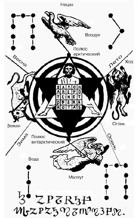 Это показывает нам, что в каждом применении карты всегда будут четыре фиксированных начала (так как символы, расположенные в четырех углах квадрата, не движутся) и определенное число подвижных начал, представленных колесом, rota, которое занимает центр символов.