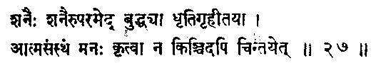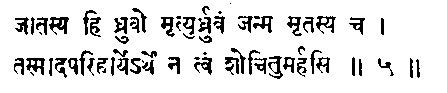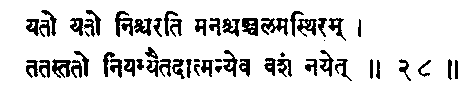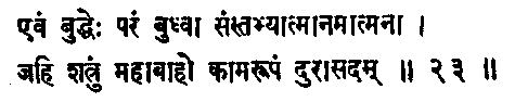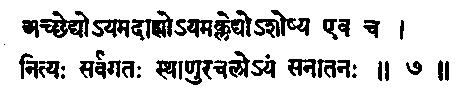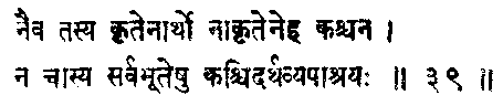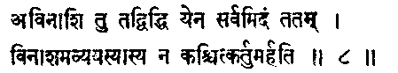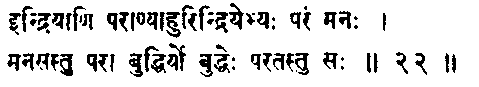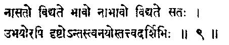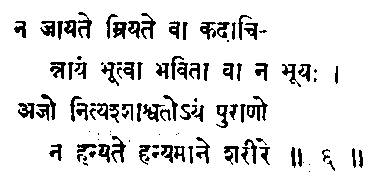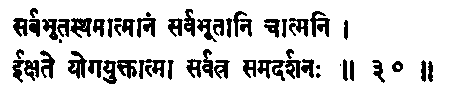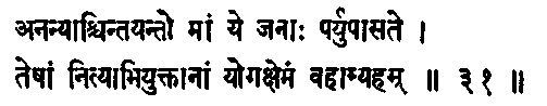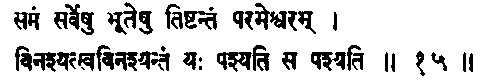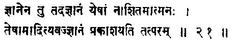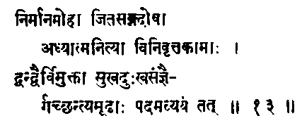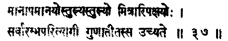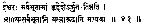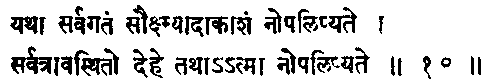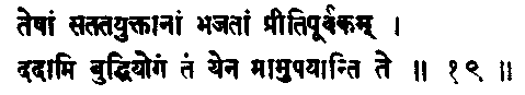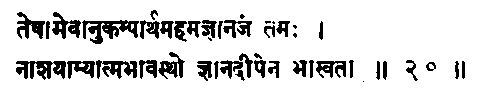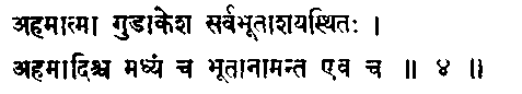 Однажды[84], когда Бхагаван беседовал с посетившим его пандитом о великих достоинствах Бхагавадгиты, один из преданных заметил, что удержать в памяти все 700 стихов очень трудно, а потому попросил отметить один стих, который следовало бы запомнить как квинтэссенцию Гиты. Бхагаван указал 20-й стих из десятой главы: