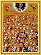 Христо?вых ученико?в ли?к се?дмьдесят боже?ственно, ве?рнии, в пе?снех восхва?лим, те?ми бо вси? навыко?хом Тро?ицу почита?ти Неразде?льную, и пребыва?ют свети?льницы боже?ственныя ве?ры.
