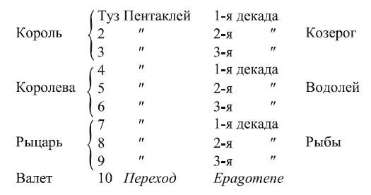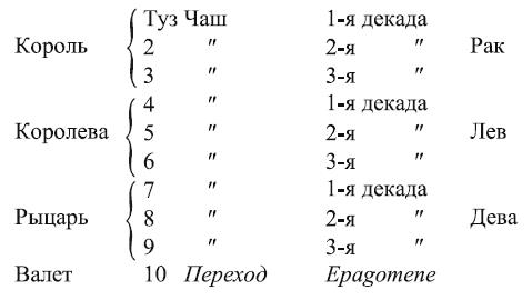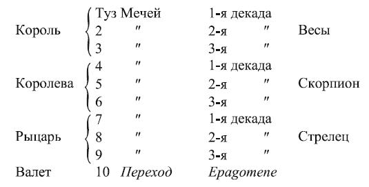 Каждая декада, управляющая десятью градусами зодиакального круга, соответствует определенному числу дней в месяце. Отсюда каждая карта младших аркан, соответствующая декаде, представляет определенную часть года: