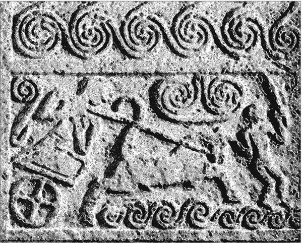 После извержения вулкана на острове Тера индоевропейские Микены стали главным источником культуры в эгейском сообществе. Арийское влияние очевидно прослеживается в микенской стеле, где изображена боевая колесница (рис. 34). Обратите внимание на то, что в этой широкой двухколесной повозке вы видите мандалу, сложенную из изображения колеса и его оси. Эта ось очень важна, являясь центром, вокруг которого вращается весь мир. Движение и состояние покоя едины, а ось символизирует неподвижную точку в душе человека – точку неподвижности. Именно здесь должен находиться тот, кто действует, – атлет, актер или писатель. Она не приходит полностью в движение – существует равновесие между покоем в центре и движением вокруг него. Таким образом, колесо боевой колесницы – это точка духовного покоя, конь – бешеная динамическая энергия тела, а возница – ум, контролирующий все происходящее.