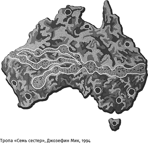 Тропы песен пронизывали весь континент. Переходя из владений одних племен в другие, они пересекали языковые границы и климатические зоны. Тропа «Семь сестер», связанная с мифом о Плеядах, начинается в землях марту на западе континента и доходит до земель питьянтьянтьяра на юге центральной Австралии, а это, по самым осторожным подсчетам, больше 500 километров[32]. Жители этих отдаленных регионов могли практически ничего не знать друг о друге и при встрече не понять в речи собеседника ни слова. Но единое «время сновидений» позволяло им найти общий язык – не лингвистический, а мифологический.