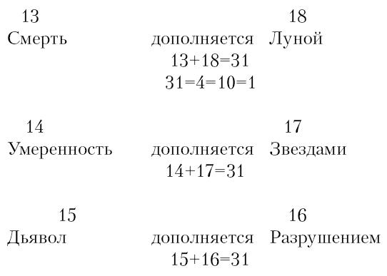 13 аркан дополняется восемнадцатым, также как пятый дополнялся вторым, а двенадцатый – седьмым (См. 5 и 8 арканы).