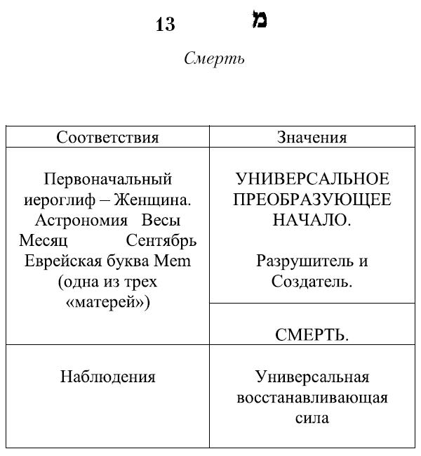Тринадцатый аркан объясняется десятым (Фортуна) и 16 (Разрушение), между которыми он находится.