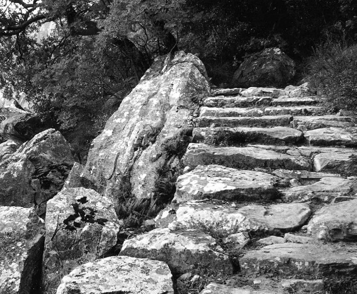 Но вот мы идем, поднимаясь все выше и выше по довольно хорошей дороге. Устав, мы делам небольшой привал у очередного поворота. Нам, ленивым, привыкшим к физическому безделью, трудно дается афонская тропа. Походив афонскими дорогами пару неделек, к концу своего пребывания на Афоне паломник приобретает «монашескую» легкость в движении. Но человеческая слабость иногда заставляет мечтать о четырехколесной оказии. Вот она уже зудит над ухом: «Здесь можно спокойно прокатиться на автомобиле, к чему физические упражнения?» Я хорошо помню, что представляла собой эта дорога несколько лет назад — сплошные ямы и ухабы. Тут извечное афонское противоречие: плохи и развалины, но и удобства на Афоне совершенно ни к чему. Как разрешить этот вопрос? Необходима золотая середина. Быть может, она и была найдена в гармоничном сочетании общежительных монастырей и отшельнических келий. Только гармония эта всегда была короткой. Наш монастырь, да и Андреевский скит обладали многими мастерскими. В скиту была даже фотолаборатория. Но тут же мне вспоминается описание кельи одного русского подвижника, жившего где-то здесь, неподалеку от Пантелеимонова монастыря, в XIX веке. «Там, между двух камней, в темном углублении, увидели мы стенку, прикрытую сверху хворостом, а в стенке дверь… В келье темно — свет едва проникал в небольшое отверстие над дверью. Постели никакой не было. У правой стенки мы заметили полку. На полке стоял кувшин и череп человеческий». Но привал закончен, и снова в путь.