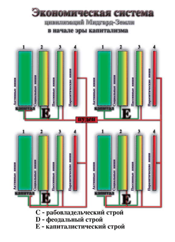 По иудейским законам, клятвы, обязательства, договоры необходимо выполнять только по отношению к иудеям, а в отношении всех остальных (не иудеев) сказано чётко и ясно то, что все оные, НЕ ЯВЛЯЮТСЯ ЛЮДЬМИ, не являются даже животными и поэтому невыполнение по отношению к этим существам любых обязательств и клятв богоугодное дело, особенно если при этом получена та или иная прибыль или выгода. Таким образом, с появлением промышленного производства и капиталистических отношений в обществе, иудеи начинают активно внедряться, используя наворованные капиталы, и в остальные категории экономических ниш. Иудейский капитал стал проникать в категорию активных экономических ниш, так как промышленное производство основывается на капитале, а к моменту возникновения оного, большинство свободных, не «привязанных» к земле капиталов находилось в иудейских руках, в результате иудейской тактики описанной выше. Подобное стало возможным только потому, что для организации промышленного производства необходимо вложить довольно большие денежные средства, которые должны быть свободными. Конечно, свободными финансами обладали не только иудеи, но большинство национальных капиталов были разрознены, не представляли из себя единой системы, в то время, как иудейские капиталы были объедены в одну систему и размеры капиталов, контролируемых ими, были просто несоизмеримы с отдельными капиталами даже очень богатых людей. Поэтому все сколько–нибудь интересные для иудеев промышленные предприятия, рано или поздно, оказывались в их руках.