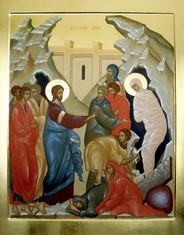 Вкупе предстасте Христу Лазареве сестре, и слезяще горце, и плачуще его, реша Ему: Господи, умре Лазарь. Он же яко Бог не неведый погребания, вопрошаше яко Человек: где положисте его? И, приступив ко гробу, возглашаше четверодневнаго Лазаря. Он же абие воста, и покланяшеся Воскресившему.
