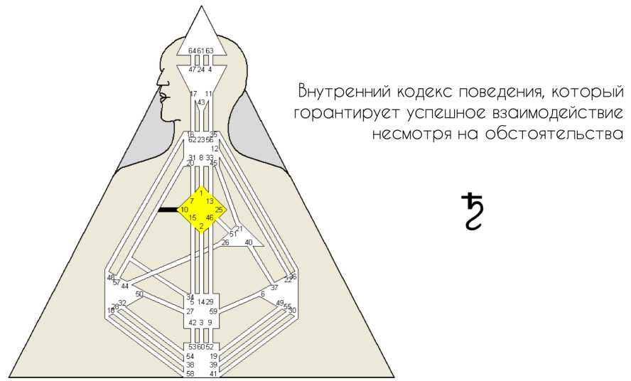 Заглавие 10-х ворот — внутренний кодекс поведения, который гарантирует успешное взаимодействие, несмотря на обстоятельства. К этой фразе можно добавить, что это происходит в различных циклах Сатурна. Во время первого цикла Сатурна основополагающий код поведения будет одним, и этот код поведения будет гарантировать успешное взаимодействие, несмотря на обстоятельства, но только в данном цикле — такое поведение не будет правильным во втором цикле, потому что второй цикл принесет свой кодекс поведения для успешного взаимодействия в любых обстоятельствах. Но тем не менее есть компас, который является корректным во всех этих циклах, во всех этих фазах жизни, и этим компасом является та гексаграмма и та линия, в которой расположен Сатурн. То есть в поведении будет разница в первые 30 лет и в последующие. Таков закон жизни, и поэтому с моей перспективы Сатурн не является планетой наказания. Нужно понимать, что большая часть астрологических интерпретаций были сделаны в 19-м веке, и с тех пор это просто переходит из книги в книгу...