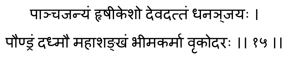 pAJcajanyam - в (раковину) по имени Пандчаджанья; hRSIkezаН - Кришна; devadattaM dhanaJjayaH - Дхананджая (Арджуна) затрубил в раковину Девадатта; pauNDraM mahA-zaGkham - в Паундру, в огромную раковину; dadhmau - затрубил, подул; bhIma-karmA vRkodaraH - Бхима, ужасный в действии, по прозвищу Врикодар.