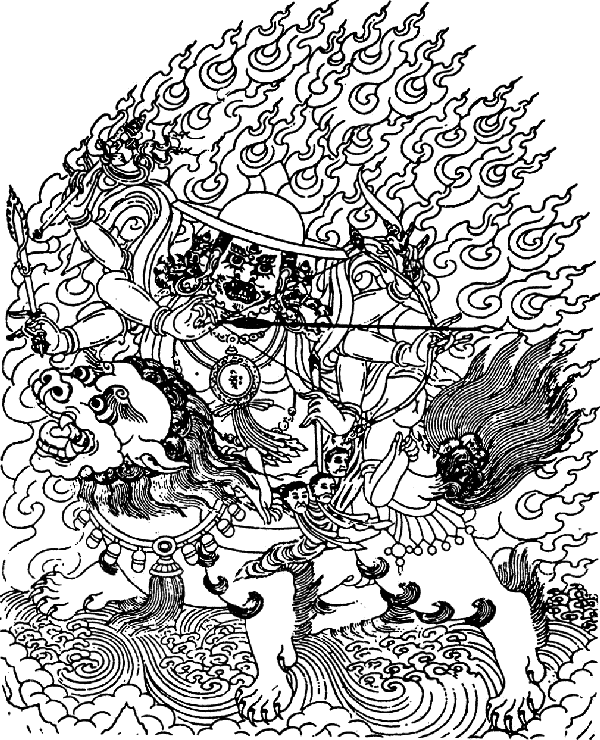 Позже, когда Гуру Ринпоче пришёл в Тибет, он вверил этому защитнику охрану Пехар Корзо Линга (Pe har dkor mdzod ling) в Самье. С этого времени он стал основным защитником царя Трисонга Децена. Впоследствии он стал очень популярен как защитник среди многих благороднорождённых высших существ (sKye chen dam pa) в различных школах тибетского буддизма. Его практиковали в линии передачи панчен-лам и линии далай-лам. В частности, он стал официальным защитником тибетского правительства во времена Пятого Далай-ламы. Всё это описано в их биографиях. И если в моём описании обнаружатся какие-то неточности, за подробностями обращайтесь к указанным первоисточникам.
