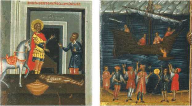 Тот встал, как бы пробудившись от сна, и уразумев, что пострадал от домохозяина, прославил Бога и с благодарностью поклонился явившемуся воину. А святой, взяв от убийцы золото, отдал его воскрешенному человеку, говоря: