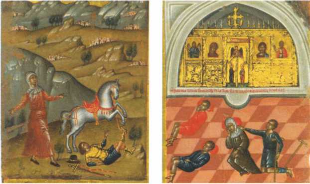 Часто ржа и свирепея, он привлек много людей на сие зрелище, ибо был праздник и в церкви находилось очень много народа. Воин, увидав такое собрание народа и видя, что конь все еще находится в ярости и что ему не от кого ждать помощи, испугался, как бы не претерпеть еще чего-нибудь более ужасного от своего коня. Посему он, оставив стыд, исповедал пред всем народом свое нечестивое намерение, и конь тотчас успокоился и сделался кротким, а воин, войдя в церковь и припав к мощам святого, молился, прося прощения за свой грех.