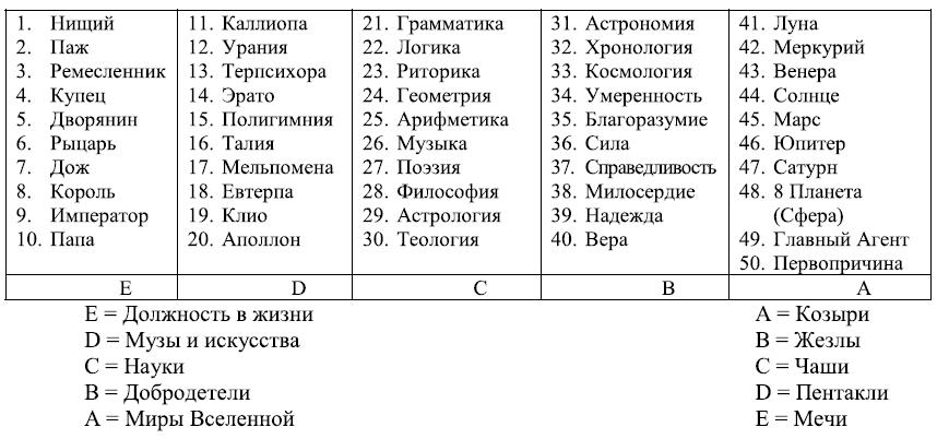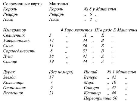 На следующей странице приведена таблица, которая отражает связь между колодами Таро и набором Мантенья. Если эту таблицу перевернуть, то вы убедитесь, что карты Мантенья произошли от карт Таро, как мы установили.
