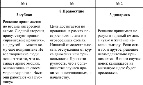У человека крайне интересный принцип принятия решения. С одной стороны он расчетлив и предусмотрителен (8 Правосудие), с другой – полностью контролирует свои ощущения, впечатления и внутренний эмоциональный отклик. Можно сказать, что человек эмоционально логичен и ключевой составляющей его стиля поведения является природное чутье, которым он великолепно пользуется.